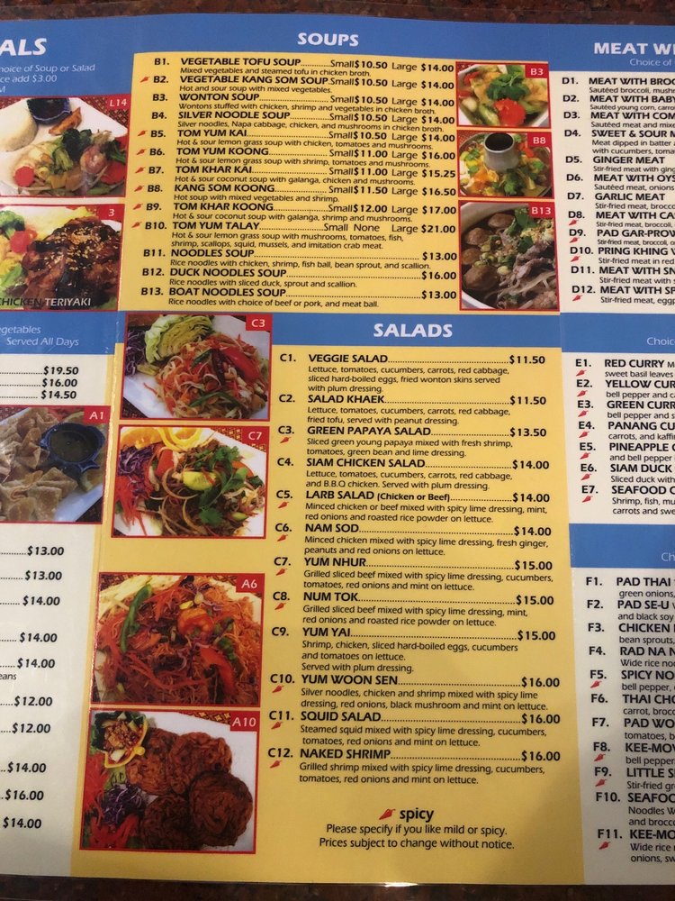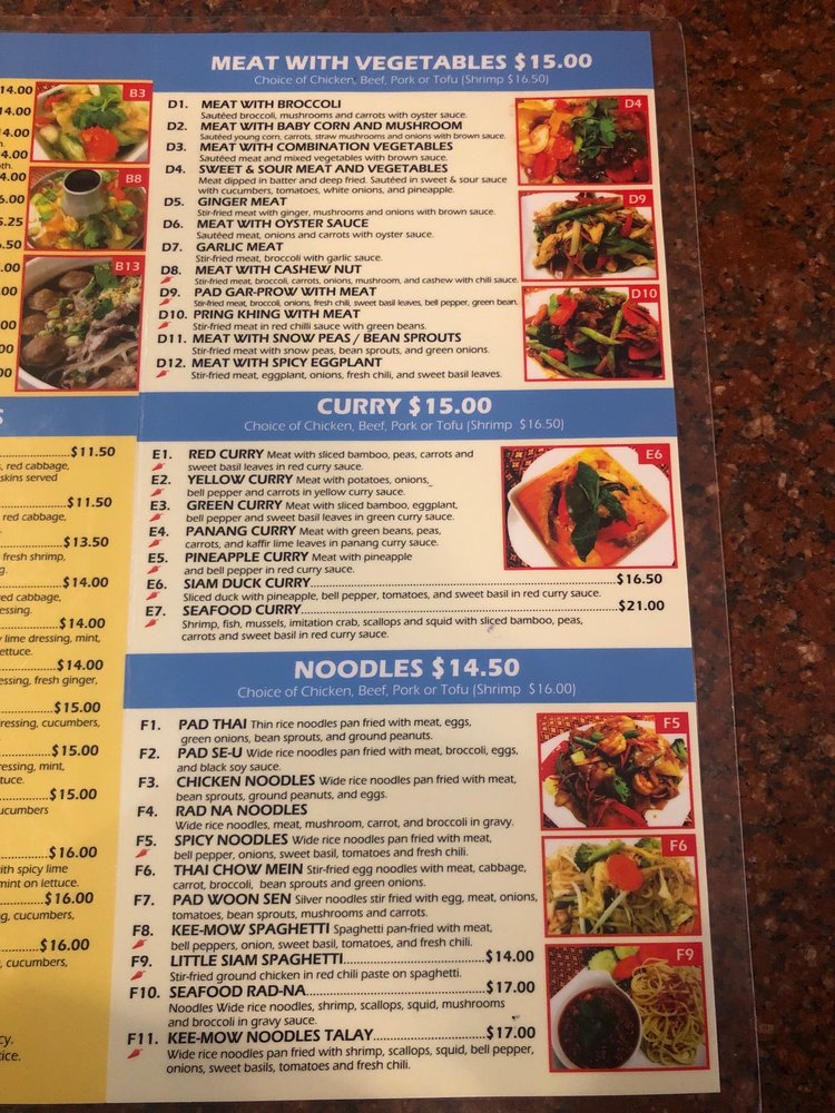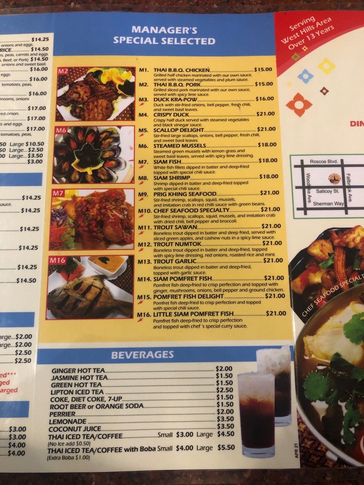 Introducing the menu at Little Siam Restaurant, a popular Thai eatery located in West Hills, CA. Offering a variety of options for vegan and vegetarian diners, this casual yet cozy spot is known for its flavorful dishes and excellent service. Customers rave about favorites like yellow chicken curry, pad Thai, and mee krob. The menu features a combination of traditional Thai fare like Pad See U and modern twists like crispy duck. With options for dine-in, takeout, and delivery, Little Siam provides a convenient and delicious dining experience for all. The restaurant's clean atmosphere, prompt service, and special discounts for first responders add to its charm. Whether you're a longtime patron or a first-time visitor, Little Siam Restaurant promises a delightful Thai culinary adventure.